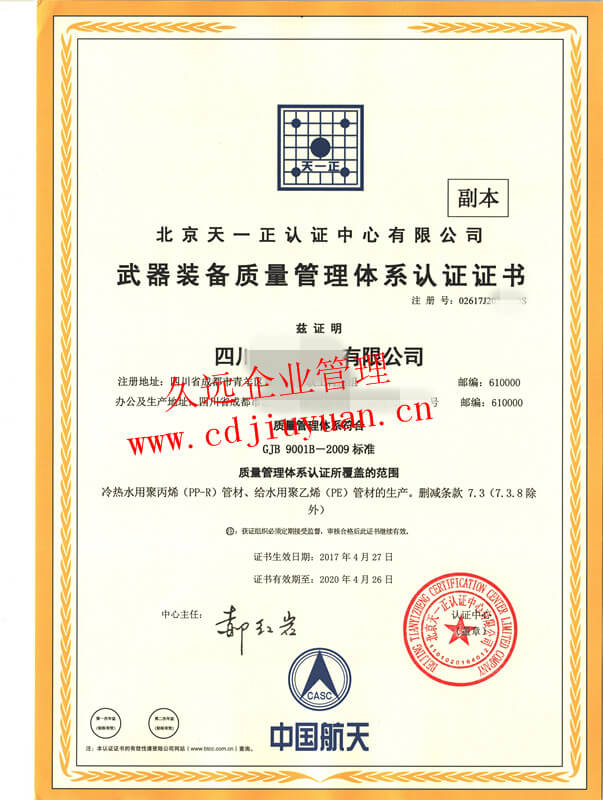 武器裝備質(zhì)量管理體系認證證書